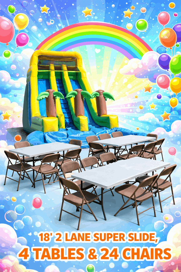 The 2 Lane Superslide Party delivers an 18 ft water slide thrill plus seating for guests. This package pairs a towering dual-lane waterslide with four tables and 24 chairs. Fast setup. Safe design. Perfect for backyard birthdays, neighborhood block parties, and summer events.
